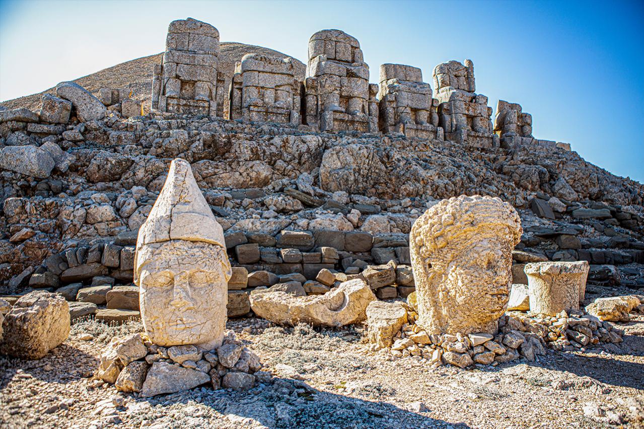 ネムルト山の最も特徴的な点は、その山頂にある巨大な石像群と墳墓で、これらはアンティオコス1世を讃えるために建設されました。巨大な石像は、王自身、神々や神話の英雄たちを象徴しており、ヒューマニズムと神秘主義が入り混じった独特な信仰体系を示しています。特に、ギリシャ神話とペルシャ神話を融合させた神々のシンボリズムは、地域の文化的多様性を物語っています。山頂には、神々の彫刻のほかに、アンティオコスの記念碑や祭壇もあり、これらは古代の信仰についての貴重な情報源となっています。