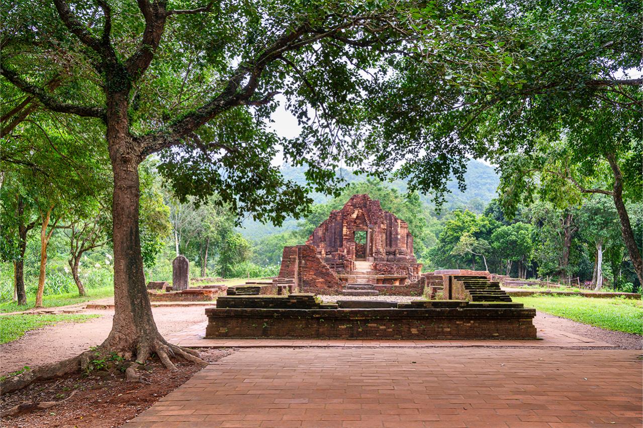 遺跡は緑豊かな山々に囲まれ、古代チャンパ文化の栄華を物語る静かな環境に位置しています。ミーソンは、宗教的儀式や王族のつながりが深く根付いた場所であり、歴史的にはチャンパ王国の強大さを象徴する地でもあります。そのため、ベトナムの歴史や文化を学ぶ上で非常に重要なスポットとなっています。